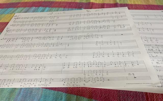 歌詞の入れ方どう考えてもわからず、歌を入れてもらった録音からスコアに歌詞を入れていくと、はじめのメロディーとは違う音やリズムが沢山あります。最近の若者達はこんなものなのかもしれませんね。yoshie’‎´•ﻌ•`